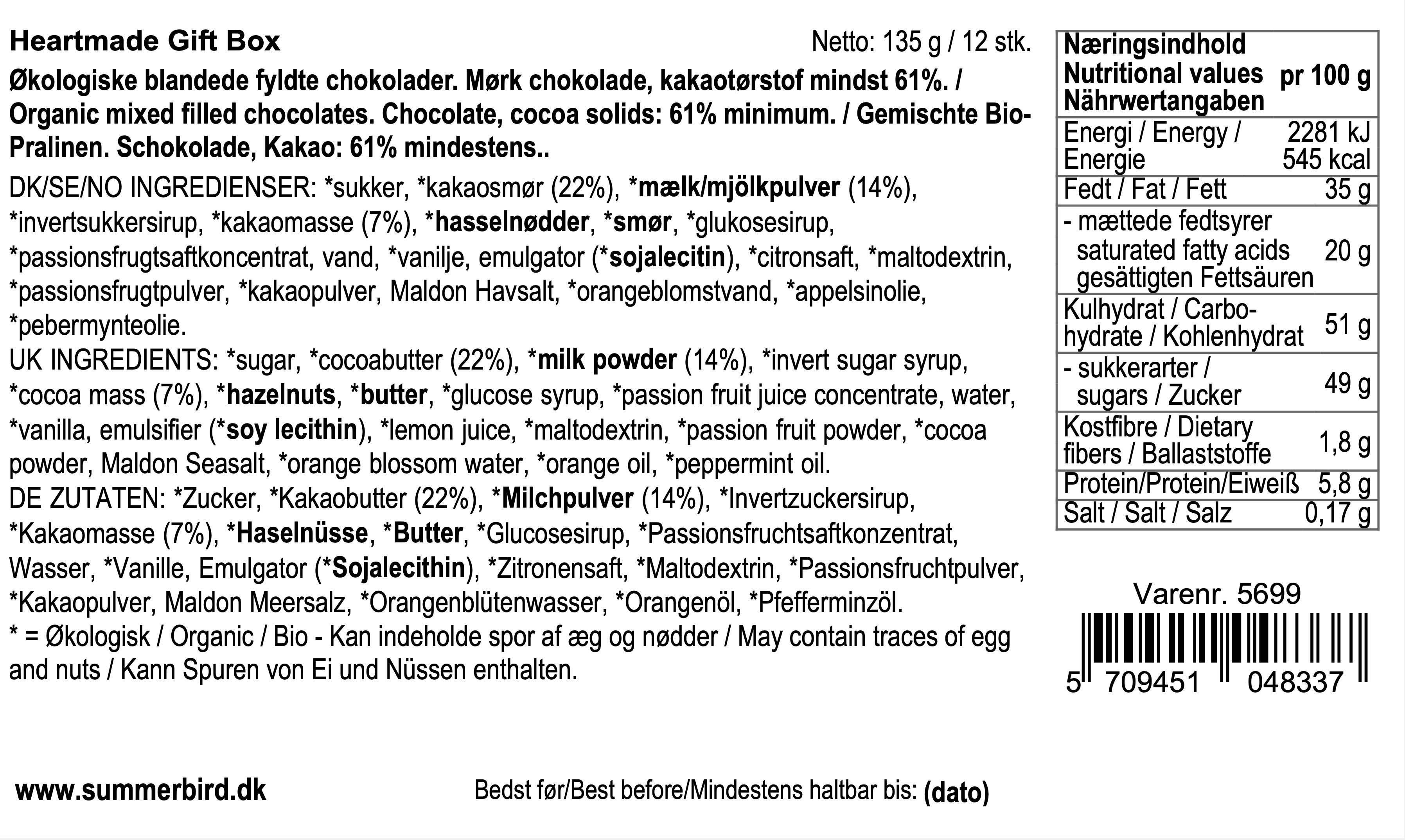 Ingredienser: Sukker, Kakaomasse, Kakaosmør, Mælkepulver, Glukosesirup, Hasselnødder, Vandfrit mælkefedt, Fedtfattig kakao, Spiritus (vodka), Emulgator (sojalecithin), karamelliseret sukkersirup, Vegetabilsk fedt (palme), Fløde, Naturlig aroma (vanilje), Lakridspulver, Mælkesukker, Kakaopulver, Olie (pebermynteolie), Ammoniumklorid, Stabilisator (E407), Fortykningsmiddel (E464), Surhedsregulator (citronsyre), Konservering (E211, E202).