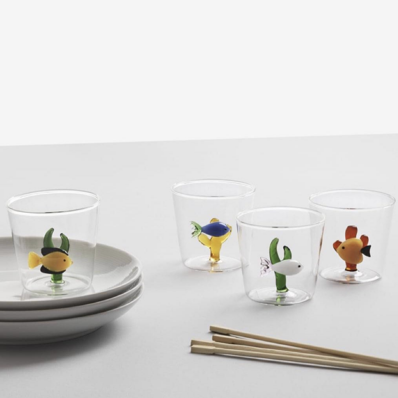 Gennemsigtige glas, helt enkle og klassiske i formen, men indeni selve glasset sidder en fisk.